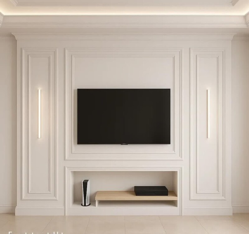 • ابعاد مناسب: ابعاد گچبری باید متناسب با اندازه دیوار و تلویزیون شما باشد. گچبری بیش از حد بزرگ یا کوچک می‌تواند تعادل بصری فضا را به هم بزند.